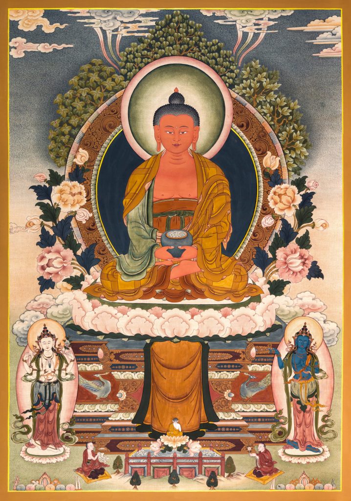 This artwork depicts Amitabha Buddha, the Buddha of Infinite Light, in the Samadhi Mudra posture. He is centrally positioned, rendered in red, and holds a begging bowl in his lap. Flanking him are the Bodhisattvas Avalokiteshvara (right) and Vajrapani (left). Amitabha reigns in the Western Paradise of Infinite Bliss and embodies longevity, discernment, pure perception, and the purification of aggregates through an understanding of emptiness.