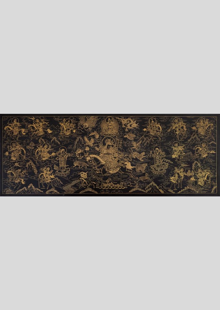 This thangka depicts the legendary King Gesar of Ling, who ruled about a thousand years ago and is venerated by Buddhists in Central Asia, Mongolia, Tibet, and Bhutan. He is celebrated for his military exploits in defending the Buddha-Dharma against various adversaries including the twelve-headed cannibal demon Lutzen to the north, Kurkar, the demonic king of Hor, the King of Jang in China, and the King of Mon in the Himalayas. The Gesar epic is recognized as the longest narrative poem in the world, with over a million verses. It is believed that possessing this thangka offers protection against all enemies.
