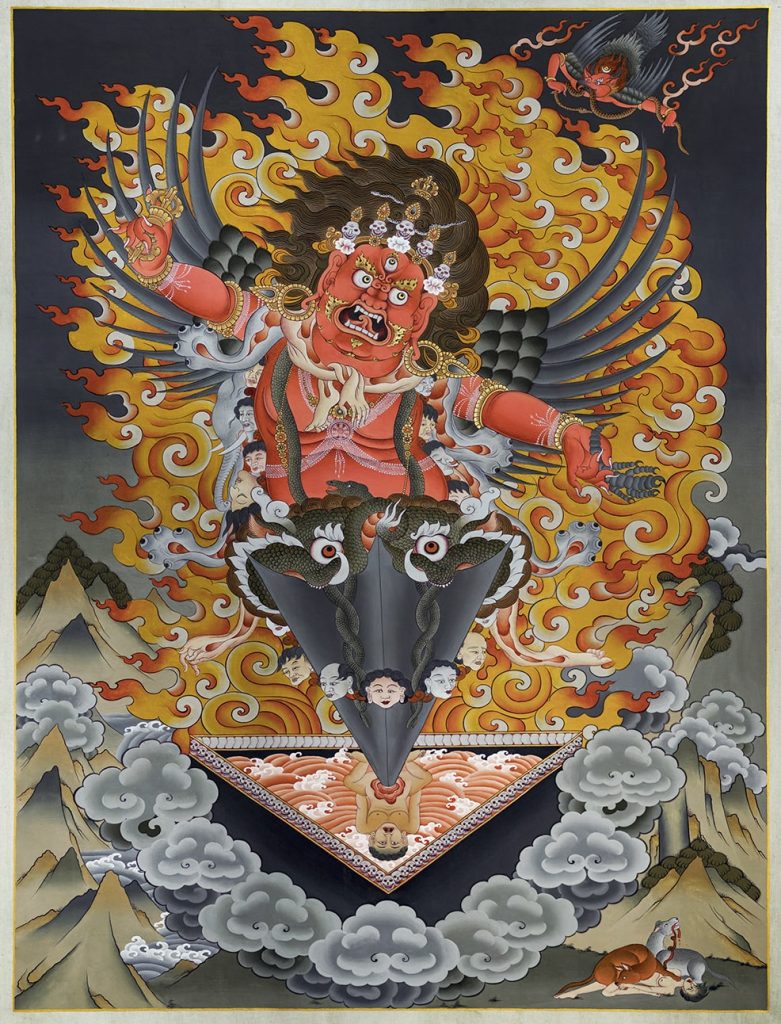 Guru Dragmar – also spelled as Guru Drakmar – is a wrathful form of Padmasambhava (Guru Rinpoche), meaning “Red Fierce Guru.” He manifests in a red, fearsome appearance to subdue negative forces, clear obstacles, and safeguard the Dharma. His “wrathful duty” involves eliminating obstacles, defeating demons, and protecting practitioners. Despite his intimidating visage—characterized by a fierce expression, weapons, and a fiery backdrop—his actions stem from compassion. His wrath serves as a skillful means (Upaya) to guide beings toward enlightenment by dispelling ignorance and harmful influences.