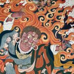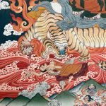 Guru Dorje Drolö, a wrathful manifestation of Guru Padmasambhava, is depicted with one face, two arms (right hand holding a vajra scepter, left a Kila peg), and a fierce stance atop a pregnant tigress. Surrounded by flames, he symbolizes the dynamic path to enlightenment, where even wrath serves compassion and wisdom. As a protector and obstacle-remover, he embodies the sometimes paradoxical nature of this journey.