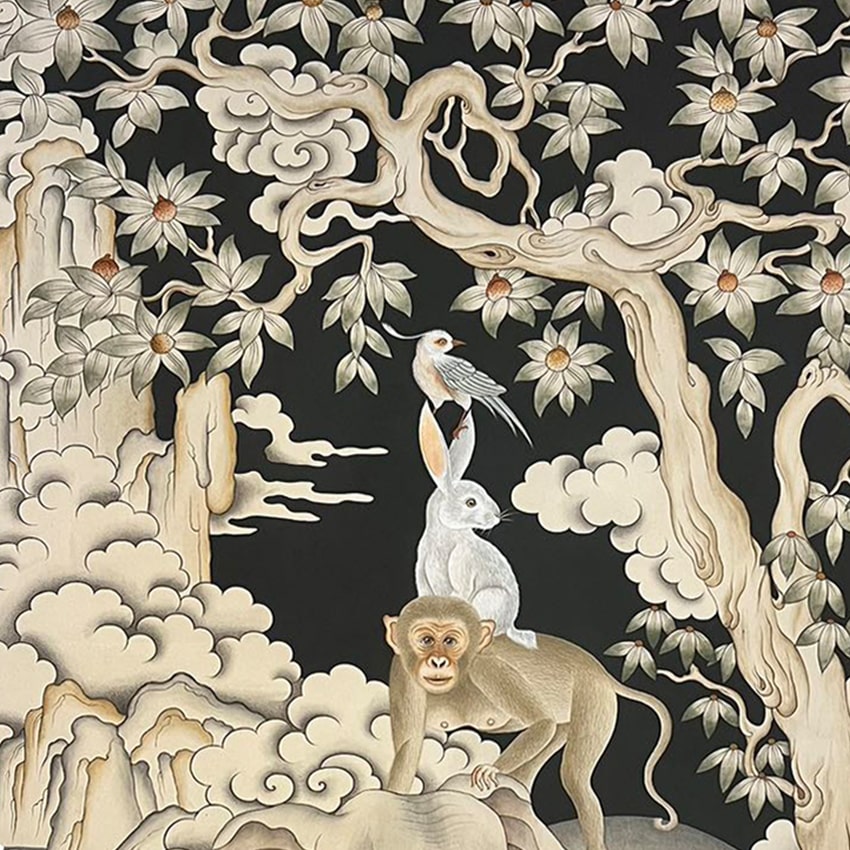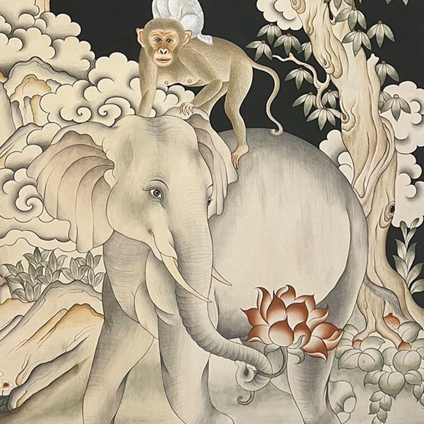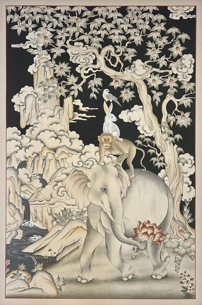 Inspired by a Jataka tale, this artwork depicts four animal companions-a bird, monkey, rabbit, and elephant-embodying Buddhist principles of peace, interdependence, and respect for elders. The piece promotes harmony and cooperation, illustrating the importance of collaboration and coexistence through the animals’ interwoven narrative. Displaying this symbol promotes these values within the home and in society.