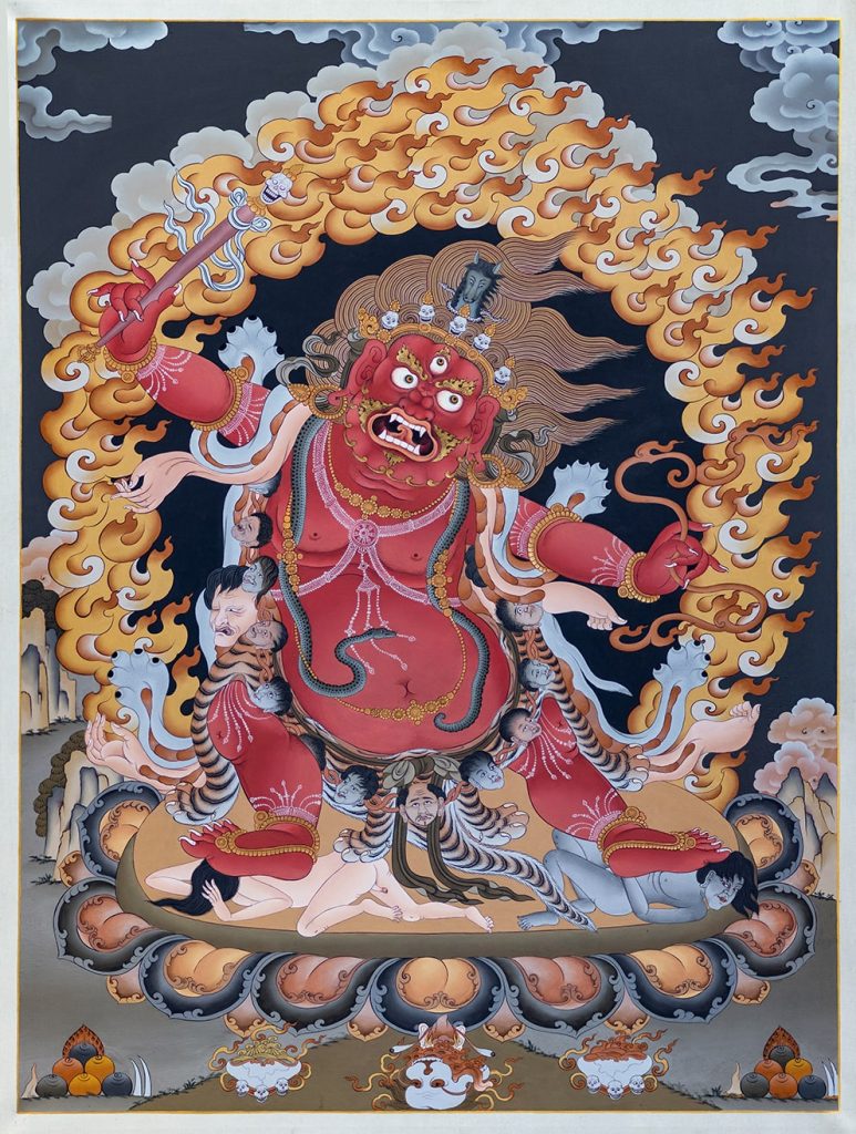 Hayagriva, a horse-headed deity in Buddhism, symbolizes profound wisdom, formidable power, and protective strength. He is famed for overcoming obstacles and the evil with his iconography, featuring a scowling face, three eyes, horse heads, a sword, and a threatening mudra, symbolizing his fierce compassion and determination to overcome challenges. In Bhutan and Tibet, Hayagriva is linked to curing certain physical ailments, while in Chinese Buddhism, he serves as a Dharma protector associated with travel. In Japanese Mahayana Buddhism, he is an aspect of Avalokiteśvara, connected to animalistic mental states.