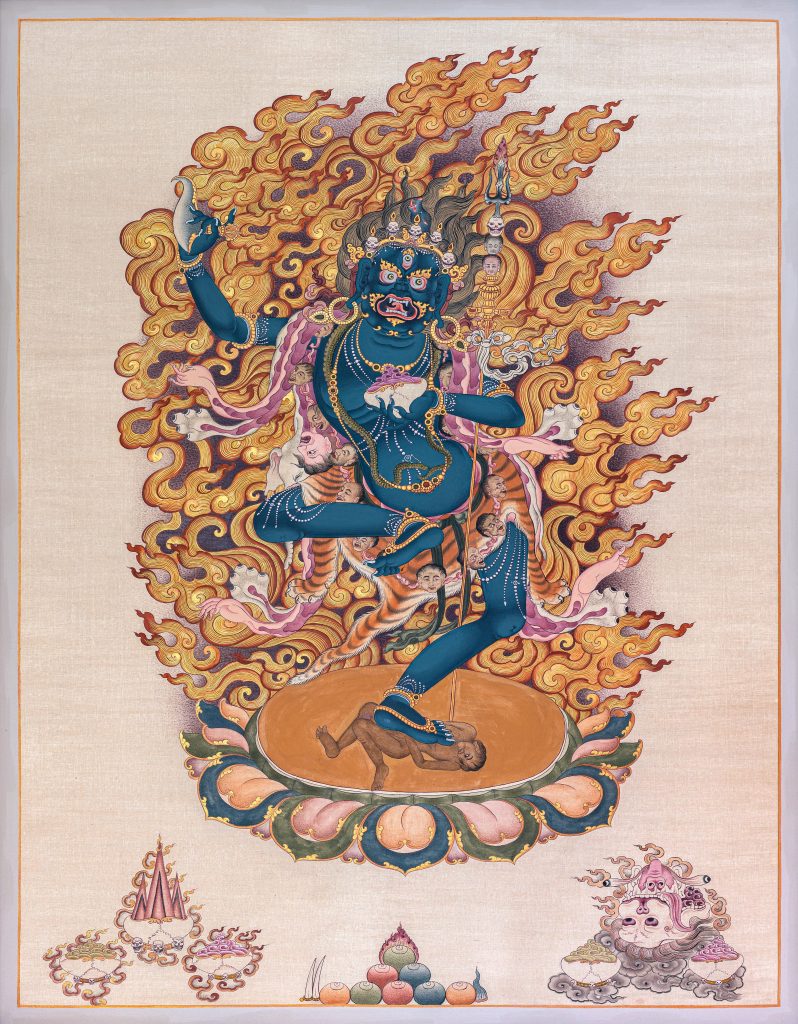 Krodhikali is depicted as a wrathful figure with blue-black skin, a central face, and a miniature pig’s head on her crown. She has three glaring eyes, a red mouth, and upward-flowing yellow hair. In her right hand, she wields a curved knife and holds a skullcup filled with blood in her left. Adorned with bone and human skin, she dances on a corpse surrounded by orange-red flames. Krodhikali practice focuses on removing attachments: externally to the body, internally to sensory objects, secretly to desires, and most secretly to the self.