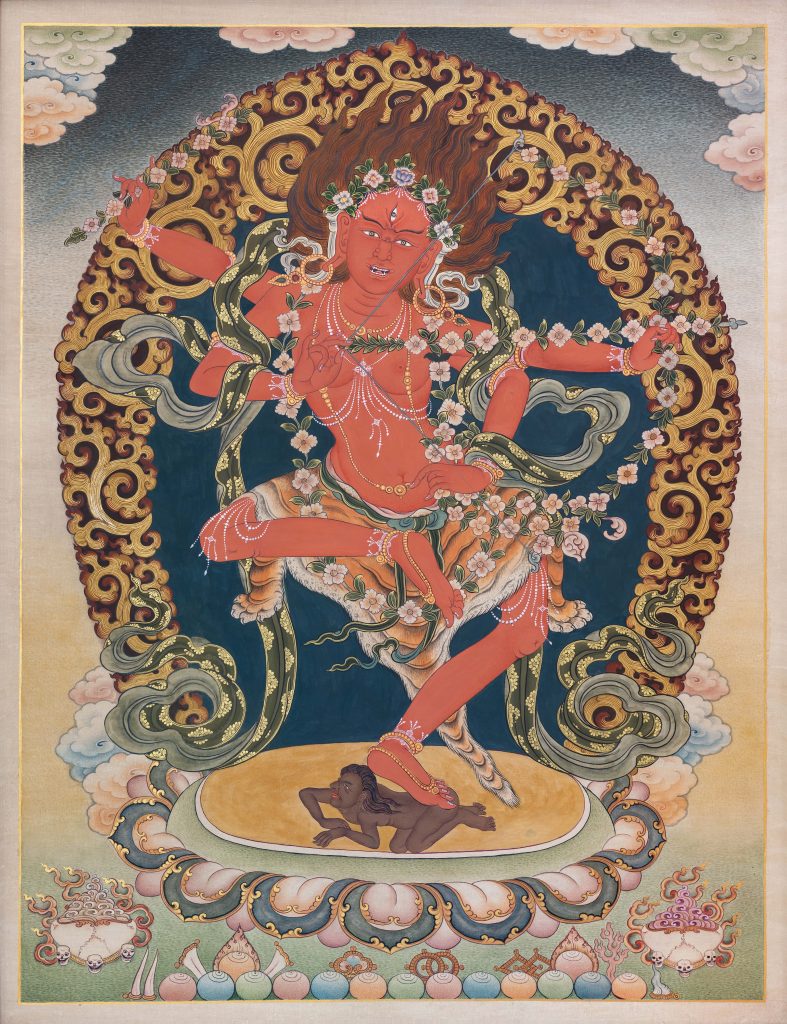 Kurukullā, a powerful, semi-wrathful form of the goddess Tara, is depicted as a red-skinned four-armed deity. She dances in a Dakini pose, wielding a flower bow and arrow in one pair of hands and a flower hook and noose in the other, vanquishing evil. Embodying ultimate wisdom, Kurukullā transforms ignorance and negative emotions into pure awareness. Her potent energy attracts wisdom, happiness, health, wealth, and longevity.