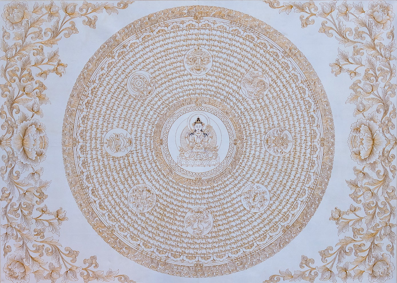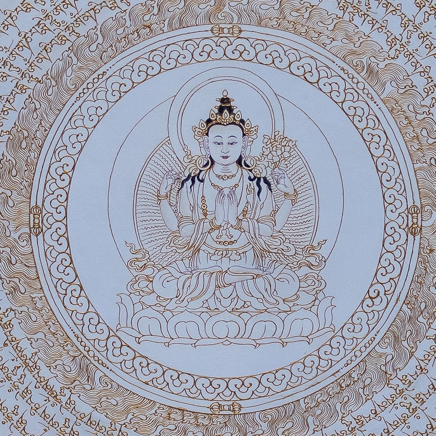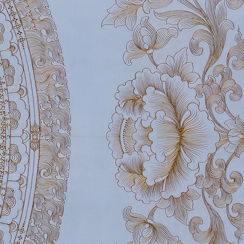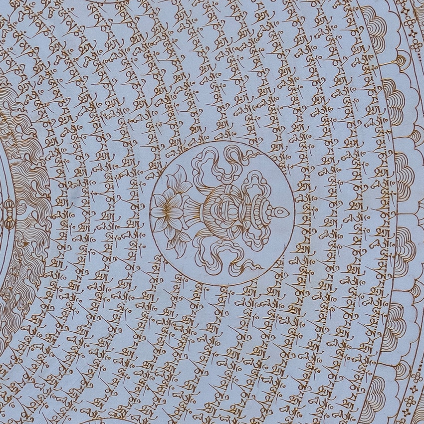 This mantra mandala is devoted to Chenrezig (Avalokiteshvara), the Bodhisattva of Compassion, depicted at the centre of the artwork. Encircling the central figure, the mantra “Om Mani Padme Hum” is inscribed, representing the phrase “Jewel in the Lotus.” Consisting of six syllables, this mantra, invoking the power and blessings of Avalokiteshvara, can transform one’s impure body, speech, and mind into the pure, exalted body, speech, and mind of a Buddha.