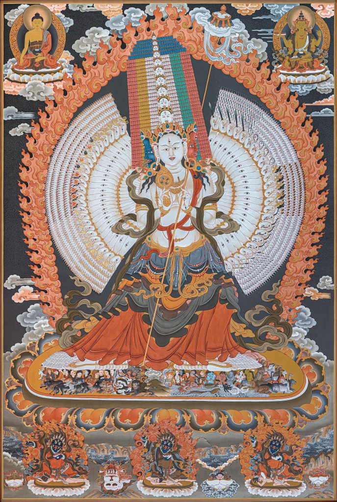 Ushnisha-sitatapatra, a powerful deity with a thousand faces, arms, and legs, each face bearing three eyes, and each hand and foot possessing an additional eye, manifests her protective power. Her white form symbolizes the enlightened energy of pacification, her primary means of defense. The Buddha proclaimed her role to vanquish all malignant demons and spells, repel enemies and dangers, and overcome hatred.