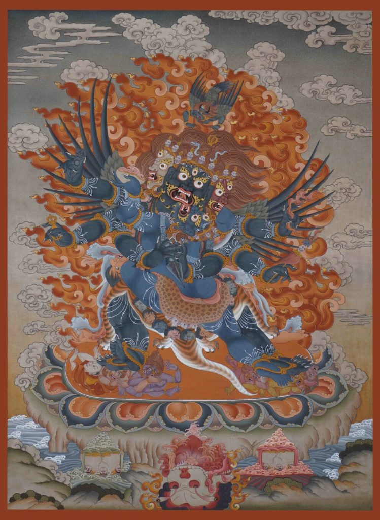 Vajrakilaya is typically depicted with three different colored faces adorned by a crown of skulls: the central face is blue, the left is red, and the right is white. He possesses six arms: two hold the Phurba, two hold a vajra each, one has a flaming snare, and another a trident. Under his feet, he crushes demons that symbolize the barriers to spiritual realization.