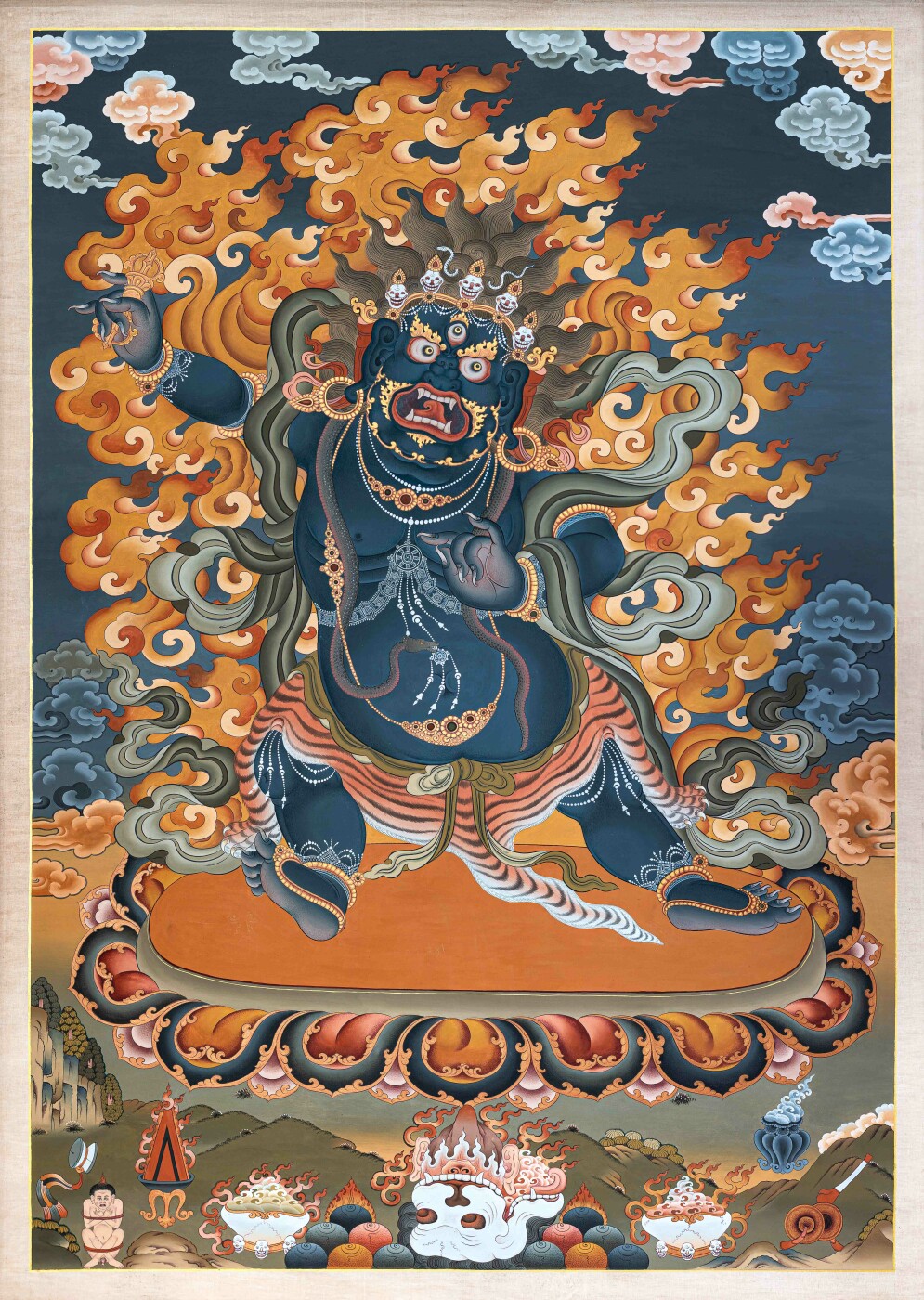 Vajrapani is depicted standing or dancing with a fierce and fear-inducing expression. He wields a vajra in his outstretched right hand, representing analytical knowledge that breaks down the mind’s attachments. Vajrapani is often shown as one of the three protective deities surrounding the Buddha. Devotees seek Vajrapani for his protective qualities, looking for strength, courage, and the removal of obstacles.