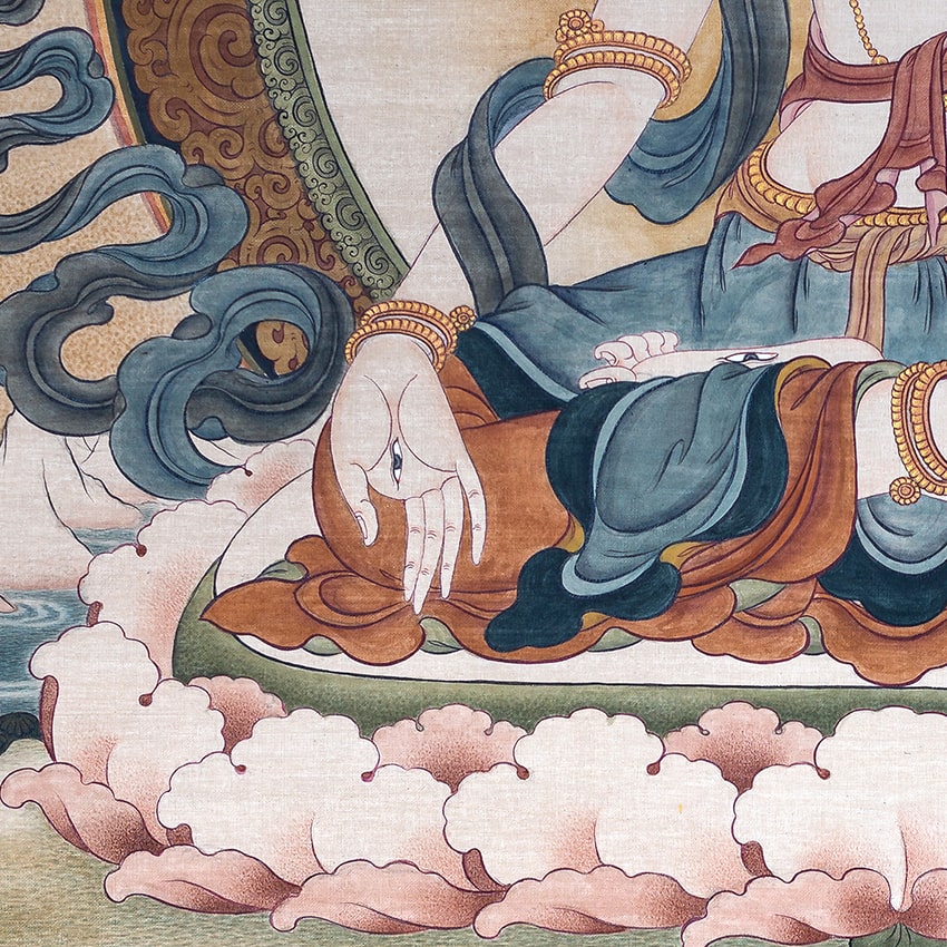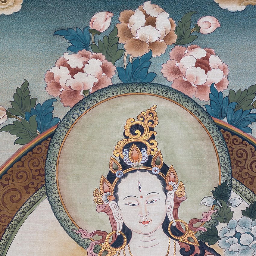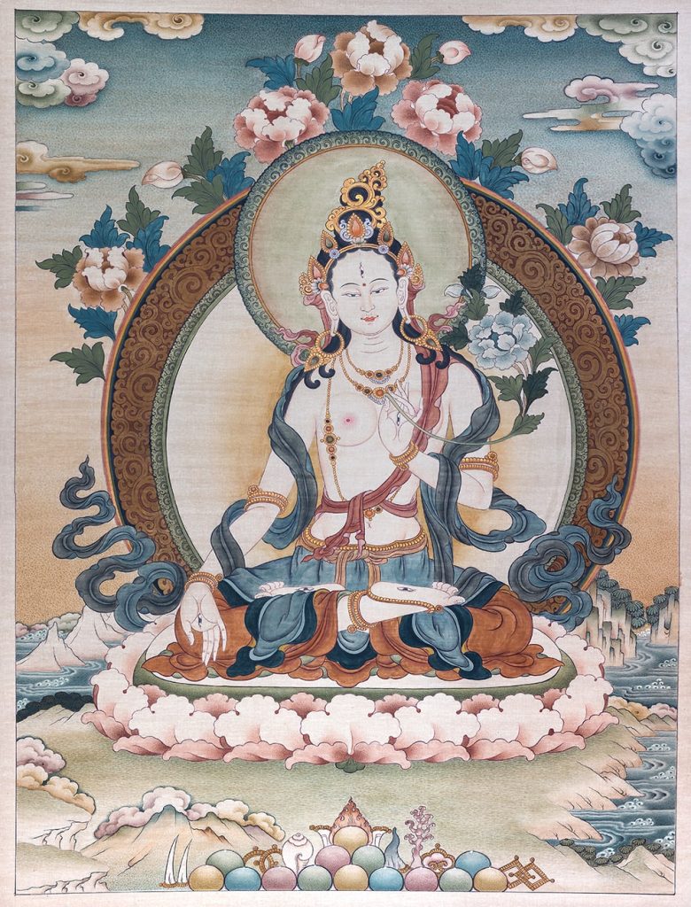 White Tara, seated in lotus posture, embodies the compassionate actions of all Buddhas. Associated with long life, wisdom, and healing, her seven eyes (one on her forehead, and one on each hand and foot) symbolize her compassionate vigilance over the world’s suffering.