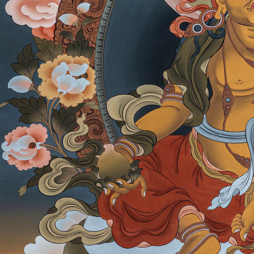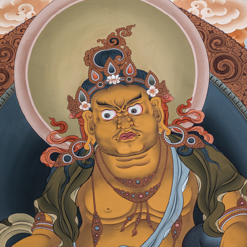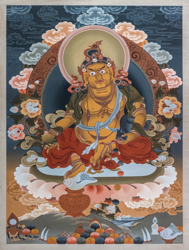 Zambala is a deity adorned with exquisite ornaments. He holds a mongoose that emits jewels, symbolizing the bestowal of material wealth. He sits on a lotus throne surrounded by symbols of prosperity, such as treasure vases and grains.